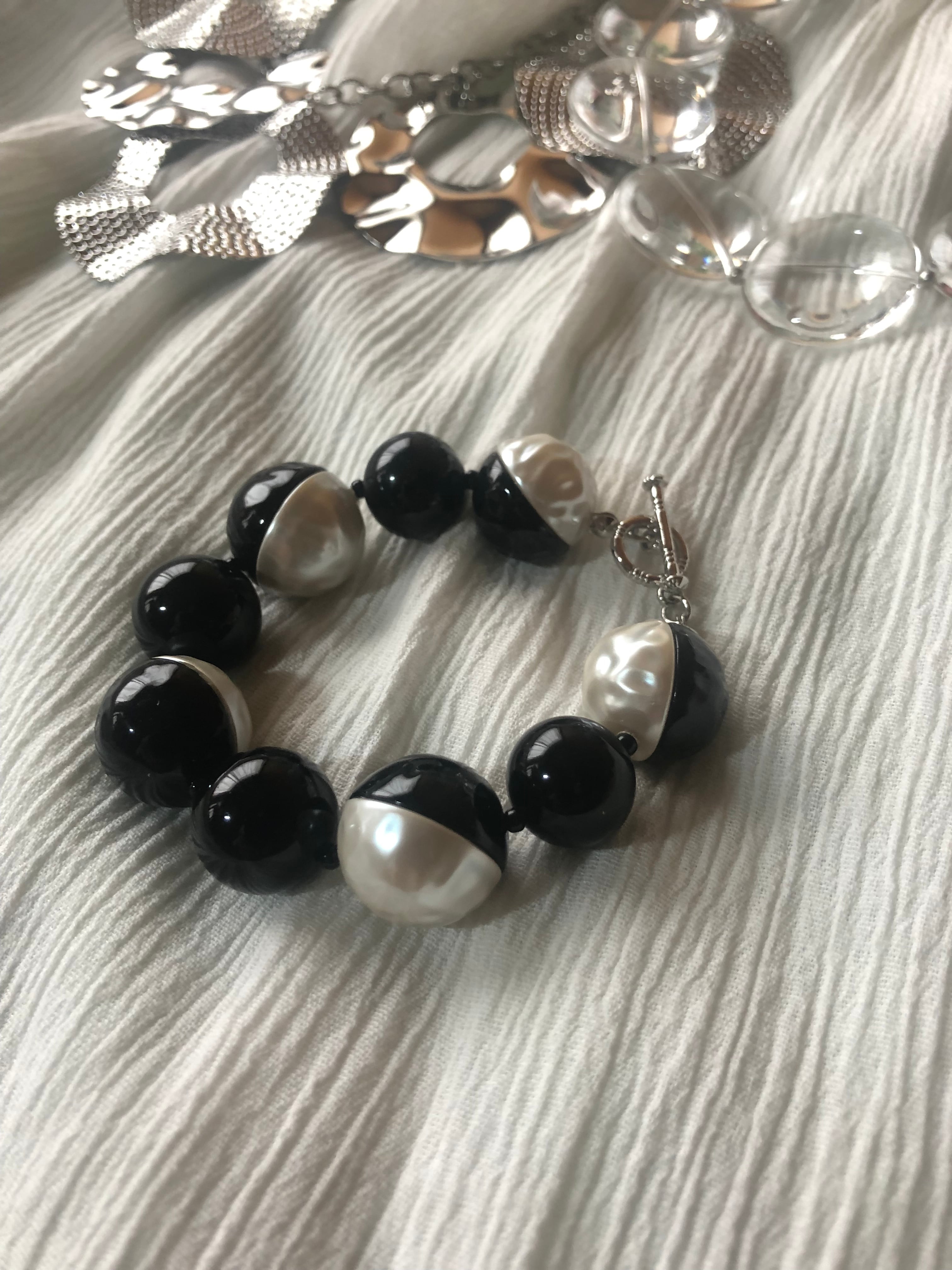 ブラックとパールのツートンカラーのパールと、ブラックのアクリルを合わせたブレスレットです。