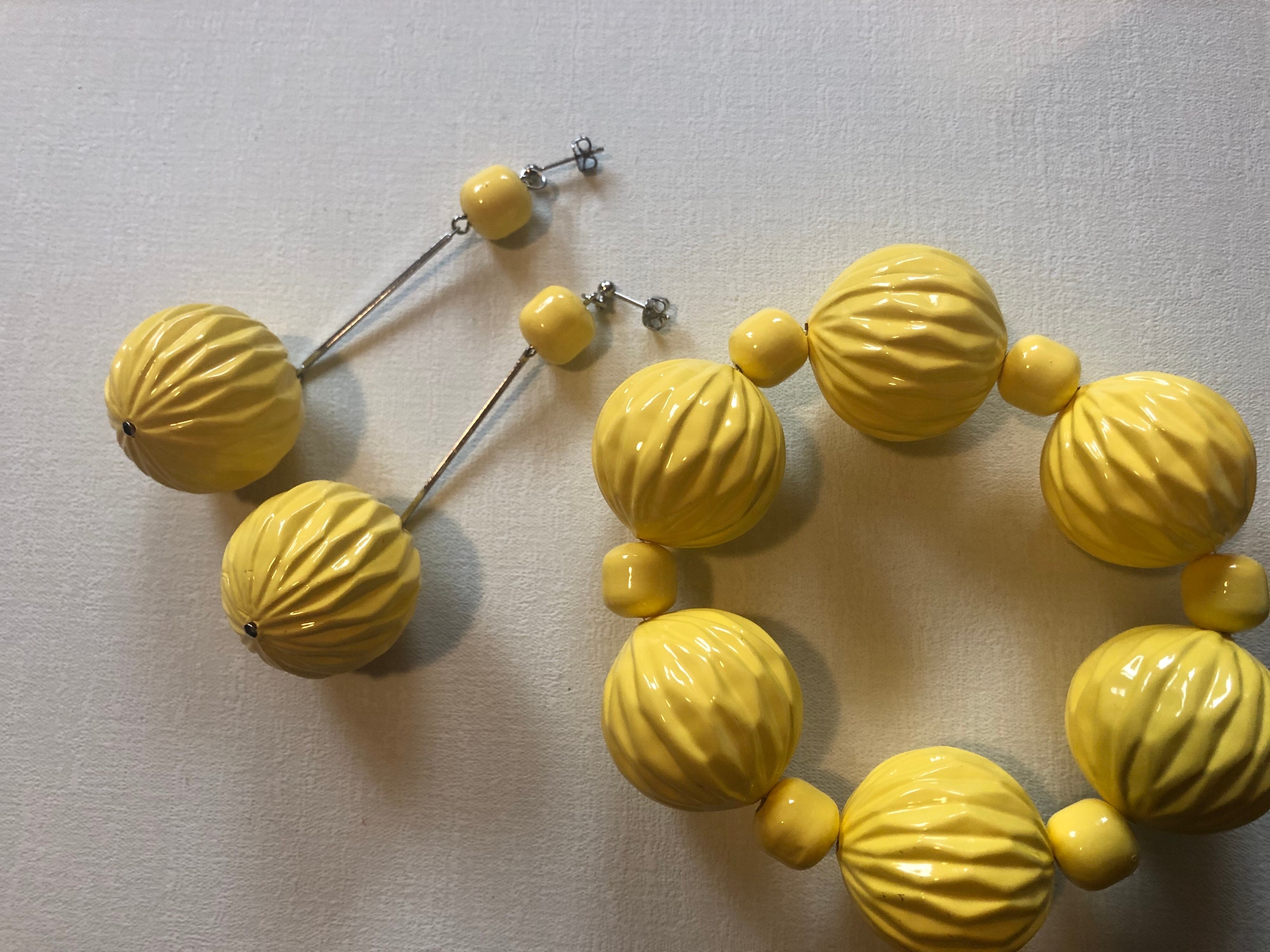 大きなメロン型のボールとお揃いの黄色い小さめのホーローパーツを合わせて、透明のゴムでブレスレットを作っております。